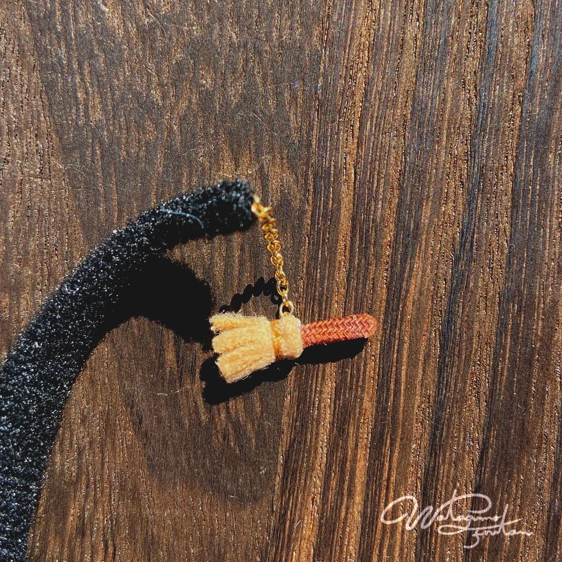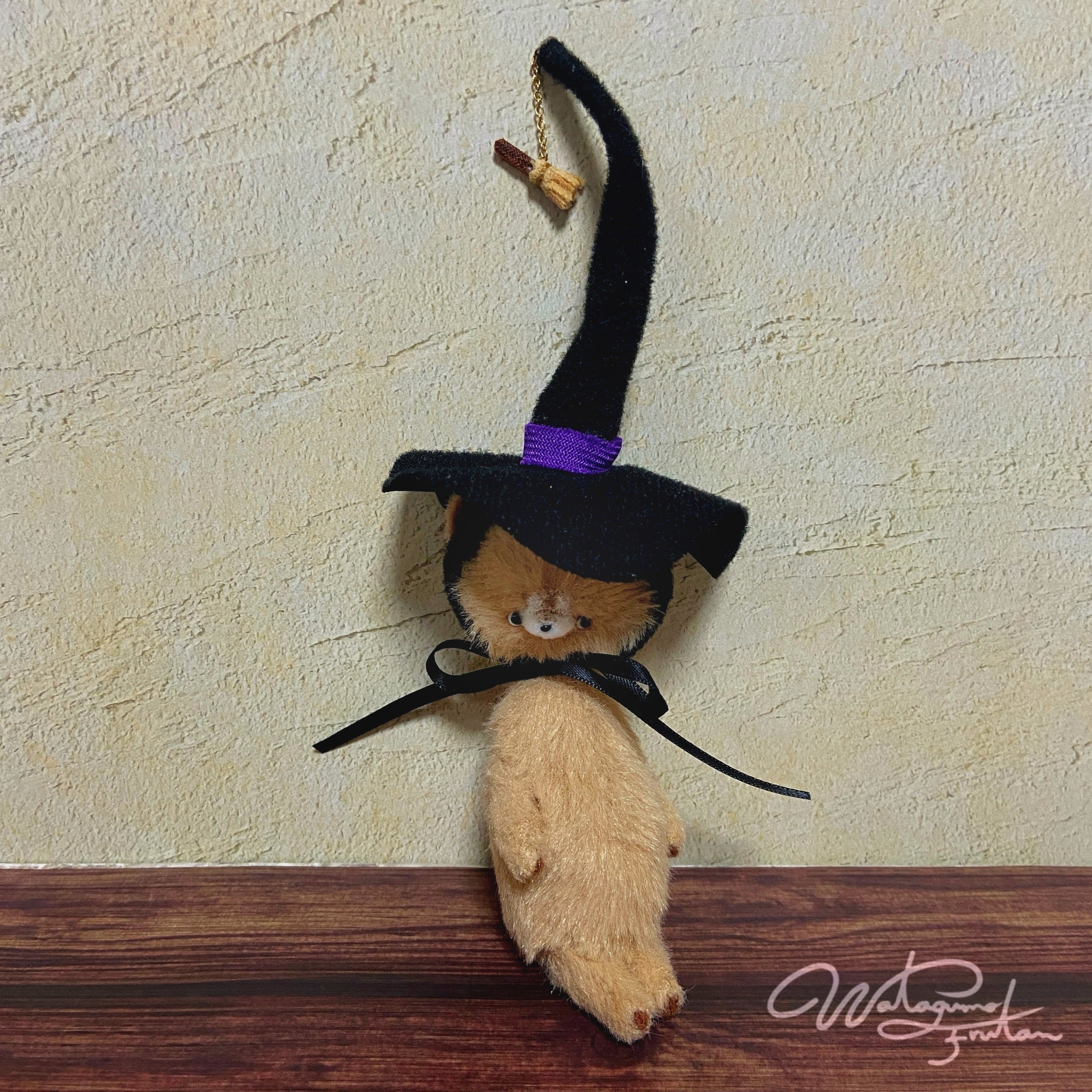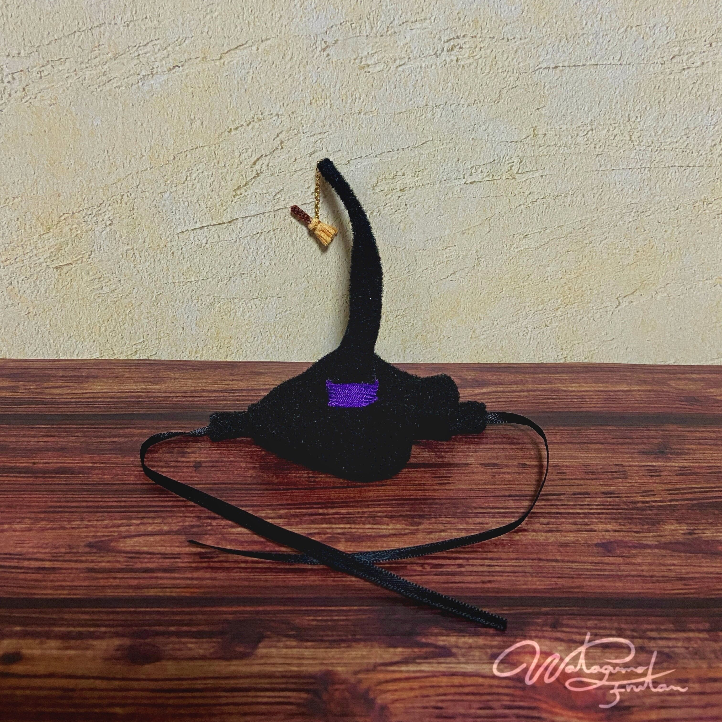 魔女帽子の先端にはお気に入りの小さな、ほうきが付いています。